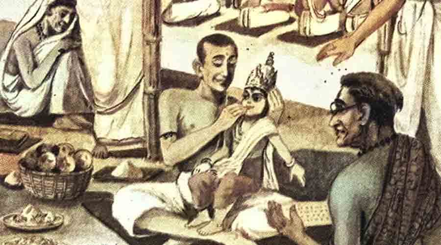પુત્રના અન્નપ્રાશનના માટે ખુદીરામે પોતાની સ્થિતિ પ્રમાણેની વ્યવસ્થા જ પહેલાં તો ગોઠવેલી. એમણે વિચારેલું કે શાસ્ત્રોક્ત ક્રિયા પૂરી કરીને રઘુવીરનું પ્રસાદી અન્ન પુત્રના મોંમાં ચટાડીને આ કાર્ય પાર પાડી દેશે અને એ પ્રસંગે બે-ચાર નજીકનાં સગાંવહાલાંને જ નોતરશે, પણ થયું કાંઈક જુદું જ. એમના પરમ મિત્ર, ગામના જમીનદાર ધર્મદાસ લાહાની છાનીમાની ચડવણીના પ્રેર્યા ગામના પ્રવીણ બ્રાહ્મણોએ અચાનક આવીને જીદ માંડી કે પુત્રના અન્નપ્રાશનના દિવસે ખુદીરામે એમને ભોજન કરાવવું જ પડશે. એમનો આવો આગ્રહ જોઈને ખુદીરામની મૂંઝવણનો પાર રહ્યો નહિ. કારણ કે ગામના બધા જણ તેમને ઘણાં આદર-માન દેતા, એટલે એમનામાંથી કોને બાકી રાખે ને કોને આમંત્રે તેની સૂઝ તેમને પડતી નહોતી. અને એ બધાંયને બોલાવવાનું ગજું તો એમનું હતું જ ક્યાં ? એટલે ‘રઘુવીર કરે તે ખરું’ એમ બોલીને તેઓ ધર્મદાસની સાથે સલાહમસલત કરીને એ વિશે જે તે નક્કી કરવા એમની પાસે ગયા અને મિત્રનો અભિપ્રાય જાણી લઈને એમને માથે જ કામનો ભાર સોંપી દઈને ઘેર પાછા ફર્યા. ધર્મદાસે પણ આનંદપૂર્વક મોટાભાગનો ખર્ચાે ખુદ પોતે ઉપાડી લઈને બધી જાતનો બંદોબસ્ત કર્યો અને સારી રીતે પ્રસંગને પાર પાડ્યો. અમે સાંભળ્યું છે કે એ રીતે ગદાધરના અન્નપ્રાશન વખતે ગામના બ્રાહ્મણ અને બ્રાહ્મણેતર બધીયે જાતના લોકો ખુદીરામના ખોરડે આવીને શ્રીરઘુવીરનો પ્રસાદ જમીને તૃપ્ત થયેલા અને સાથે સાથે અનેક દરિદ્ર ભિક્ષુકોએ પણ એવી જ તૃપ્તિ પામીને તેમના પુત્રના દીર્ઘાયુષ્ય અને મંગળ માટે કામના કરેલી.